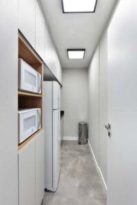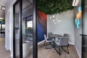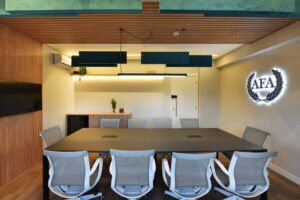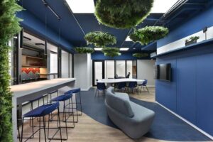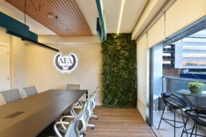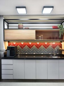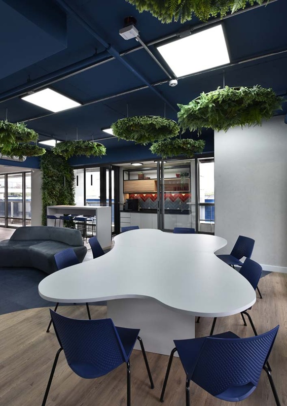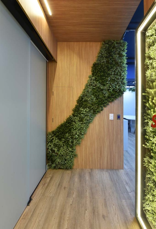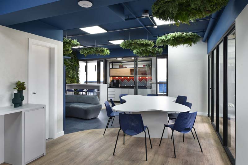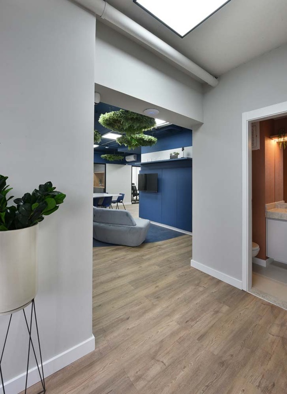 Os espaços se moldam às necessidades da equipe, equilibrando momentos de interação e concentração. A madeira aquece, o verde respira, e a disposição estratégica dos elementos favorece um ritmo de trabalho mais intuitivo. A área de descompressão surge como um convite à pausa criativa, onde formas, texturas e cores criam um cenário que inspira e revitaliza.
